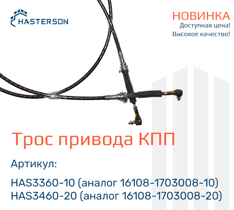 Трос привода КПП HASTERSON на КамАЗ 6580/65801/65802 (в сборе стопорные пластины,пыльники, с наконечниками) (OEM 16108-1703008-10) HASTERSON